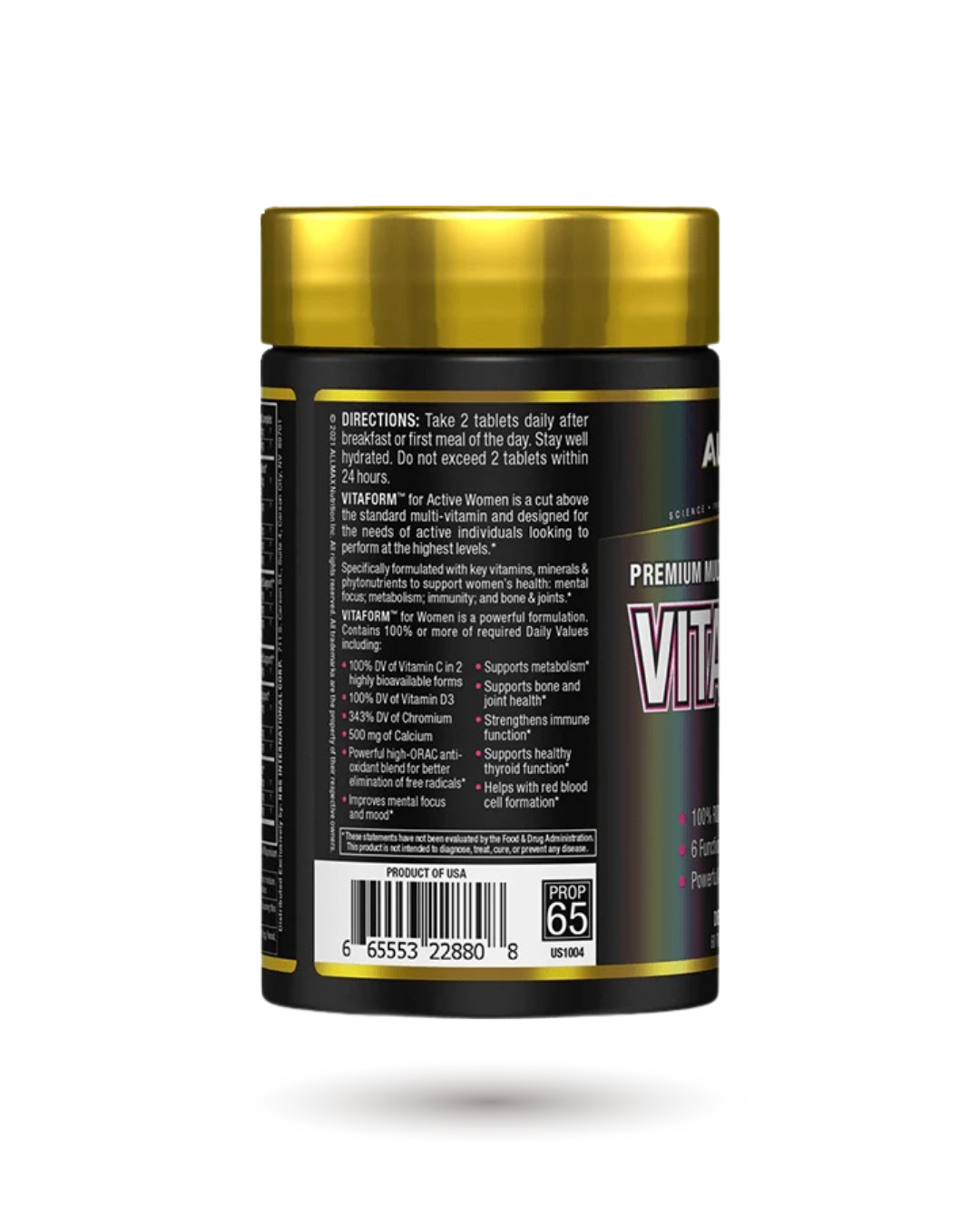 VITAFORM Women’s Multivitamin contains a powerful high-ORAC anti-oxidant blend for better elimination of free radicals and aids in improvements to mental focus and mood. It also helps support the metabolism, a healthy thyroid function, bone health & decreases risk of osteoporosis. Furthermore, it also contains key ingredients to help strengthen the immune function and help with red blood cell formation*