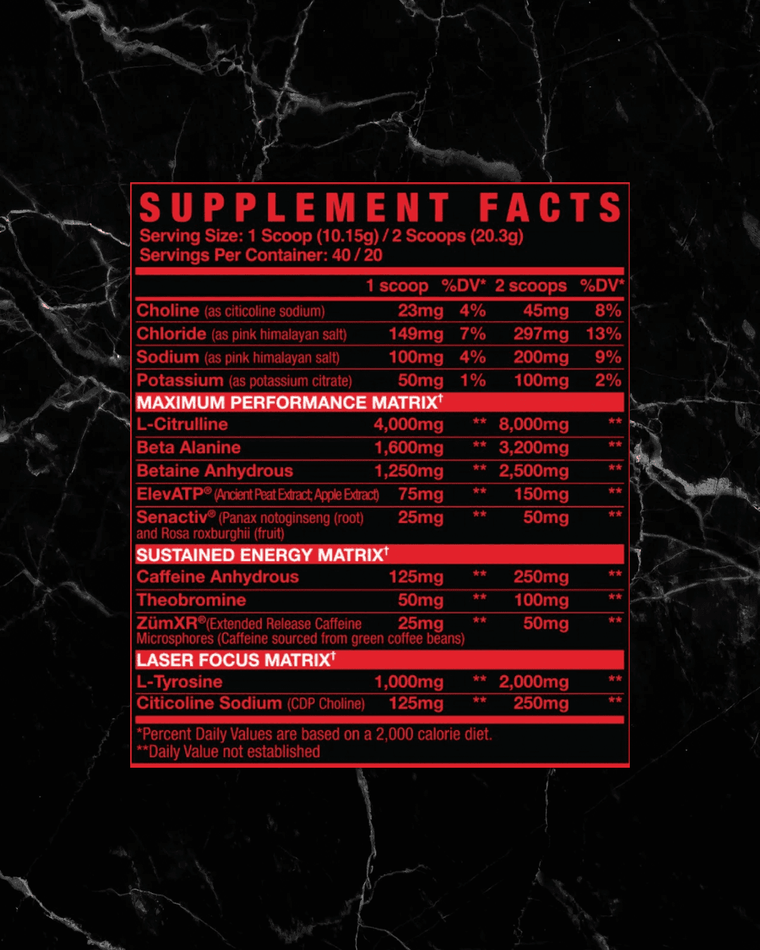 The all-in-one pre-workout Intake is a comprehensive formula designed to deliver endless energy, insane pumps, laser-sharp focus, and maximum performance. It features 8 grams of L-citrulline, 3.2 grams beta alanine, 2.5 grams betaine anhydrous, and 300 milligrams of caffeine from caffeine anhydrous and ZumXR® extended-release caffeine. Intake is also loaded with cutting-edge trademarked ingredients, such as Senactiv®, ElevATP®, and CDP-choline.