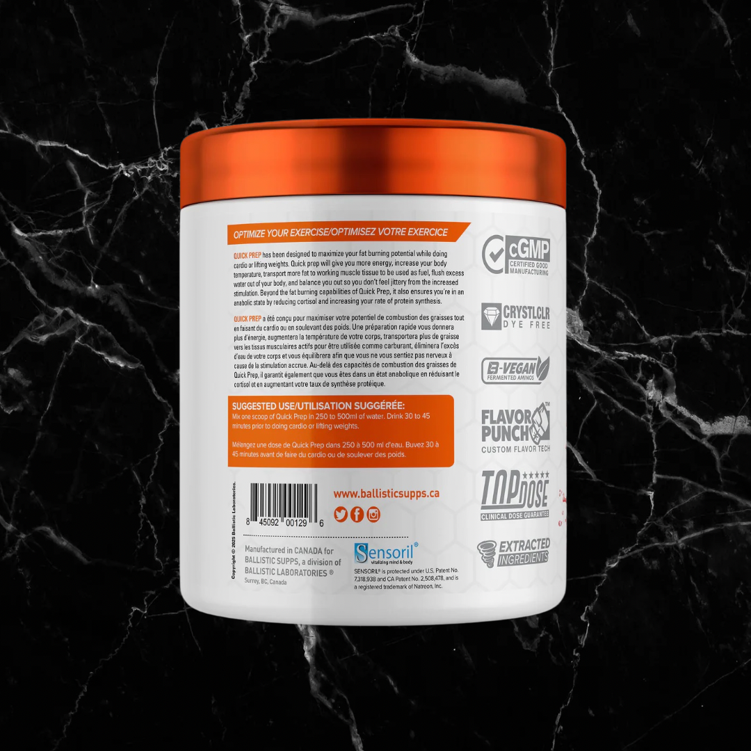 Ballistic Supps QUICK PREP has been designed to maximize your fat burning potential while doing cardio or lifting weights. QUICK PREP will give you more energy, increase your body temperature, transport more fat to working muscle tissue to be used as fuel, flush excess water out of your body, and balance you out so you don’t feel jittery from the increased stimulation. QUICK PREP also ensures you’re in an anabolic state by reducing cortisol and increasing your rate of protein synthesis.