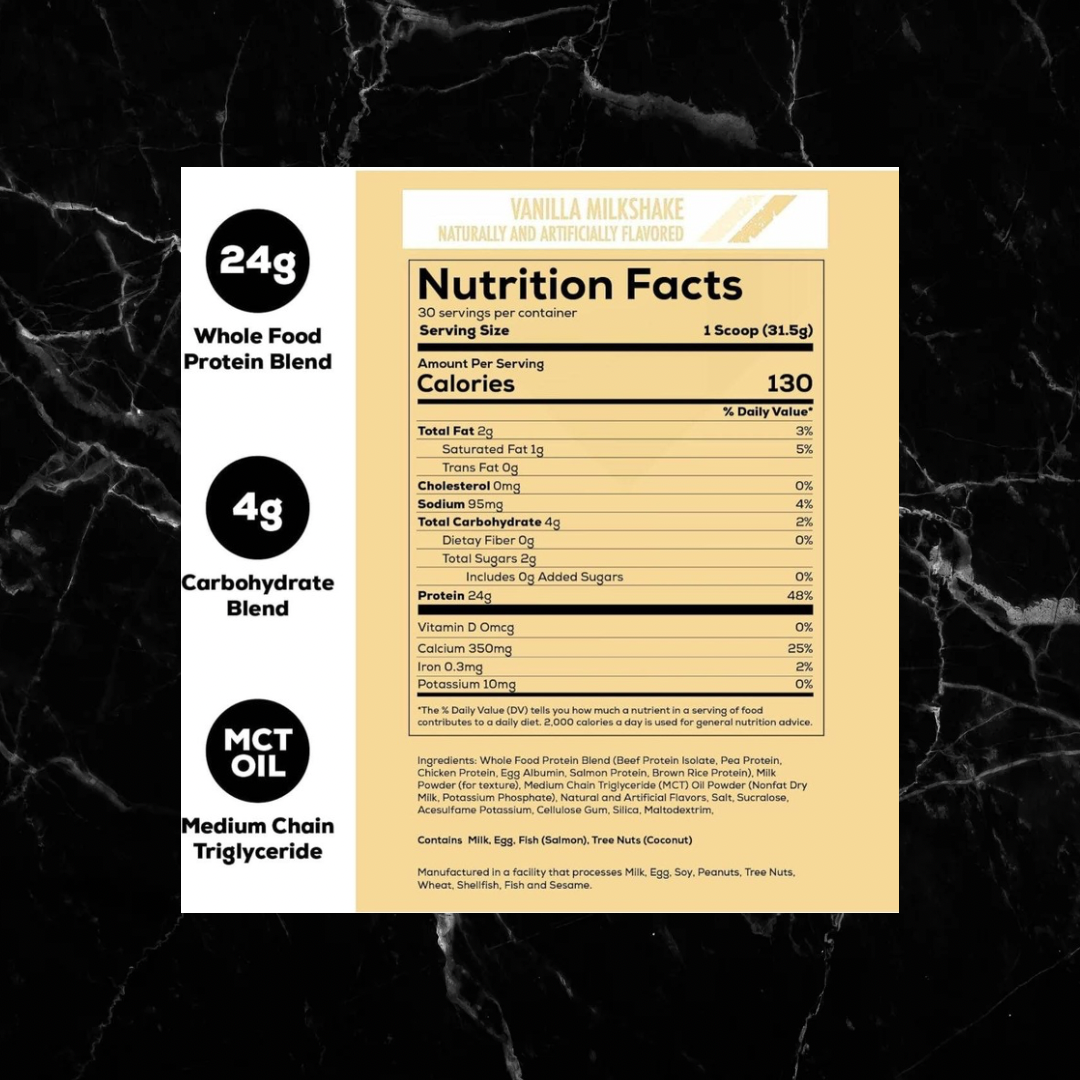 Whole food protein blend (beef protein isolate, pea protein, chicken protein, egg albumin, salmon protein, brown rice protein), milk powder (for texture), cocoa (processed with alkali), medium chain triglyceride oil powder (nonfat dry milk, potassium phosphate), natural and artificial flavors, salt, sucralose, acesulfame potassium, cellulose gum, silica, maltodextrin.