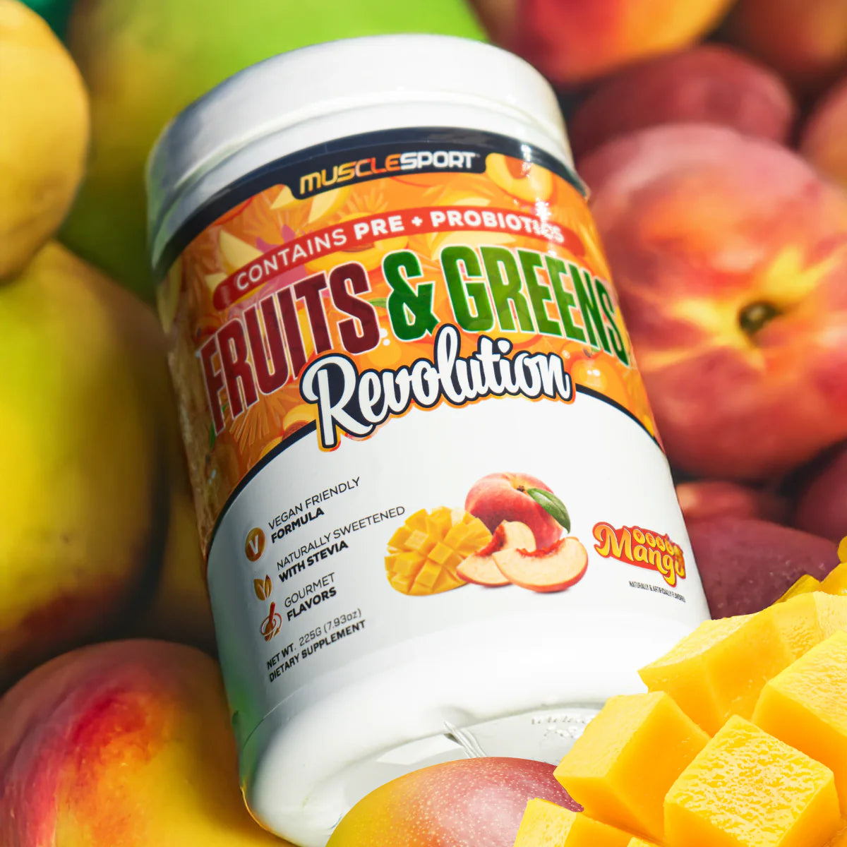 Supplement Clearance – Muscle Sports Fruits & Greens (Chocolate, Peach Mango, Pineapple Splash – 30 Servings)