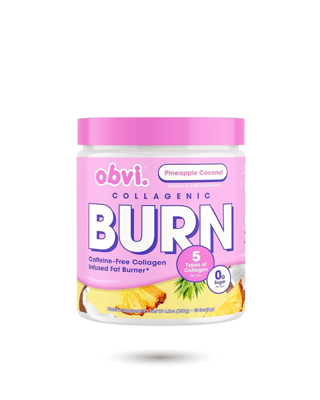 Supplement facts for Obvi Collagenic Burn Powder Pineapple Coconut flavor, listing multi-collagen matrix, Morosil, and herbal fat-burning ingredients.