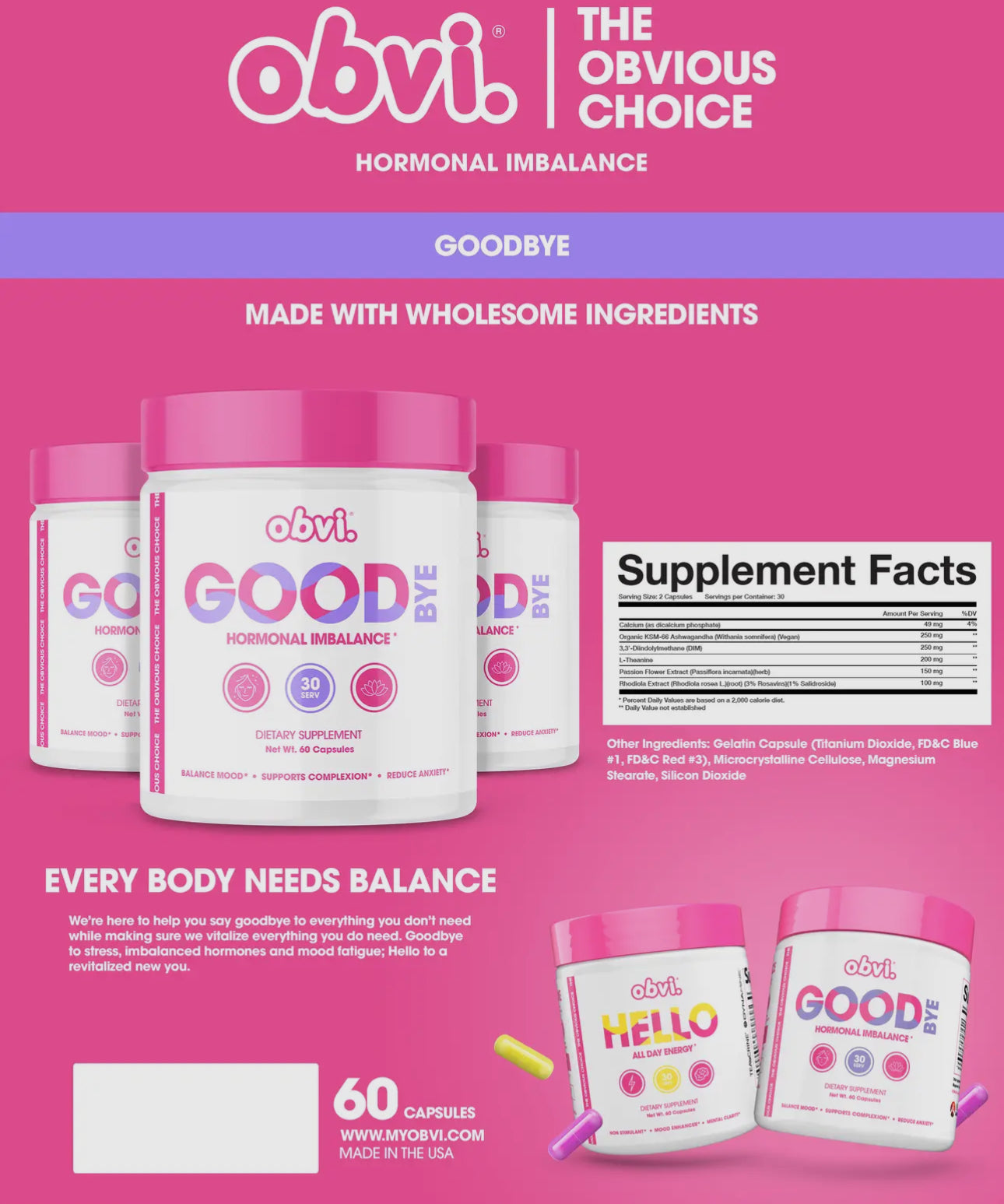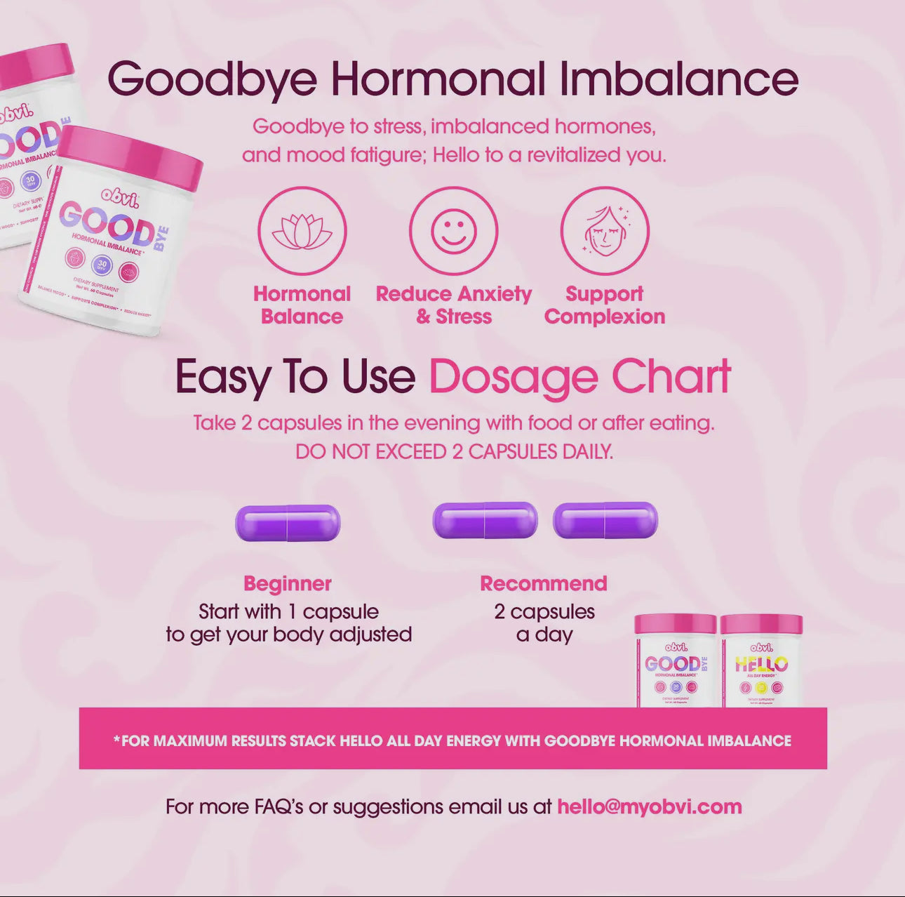 Take control of your hormonal health with Obvi's Goodbye Supplement. Expertly formulated to address stress, imbalanced hormones, and mood fatigue, these capsules help reduce hormonal acne, mood swings, anxiety, and stress by lowering cortisol levels. Restore balance and vitality to your life with this powerful hormonal support.