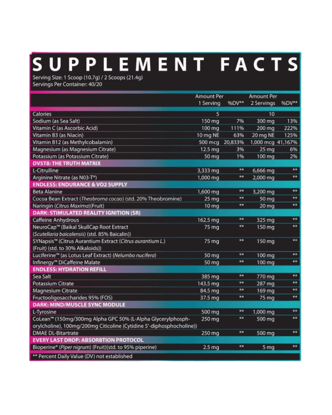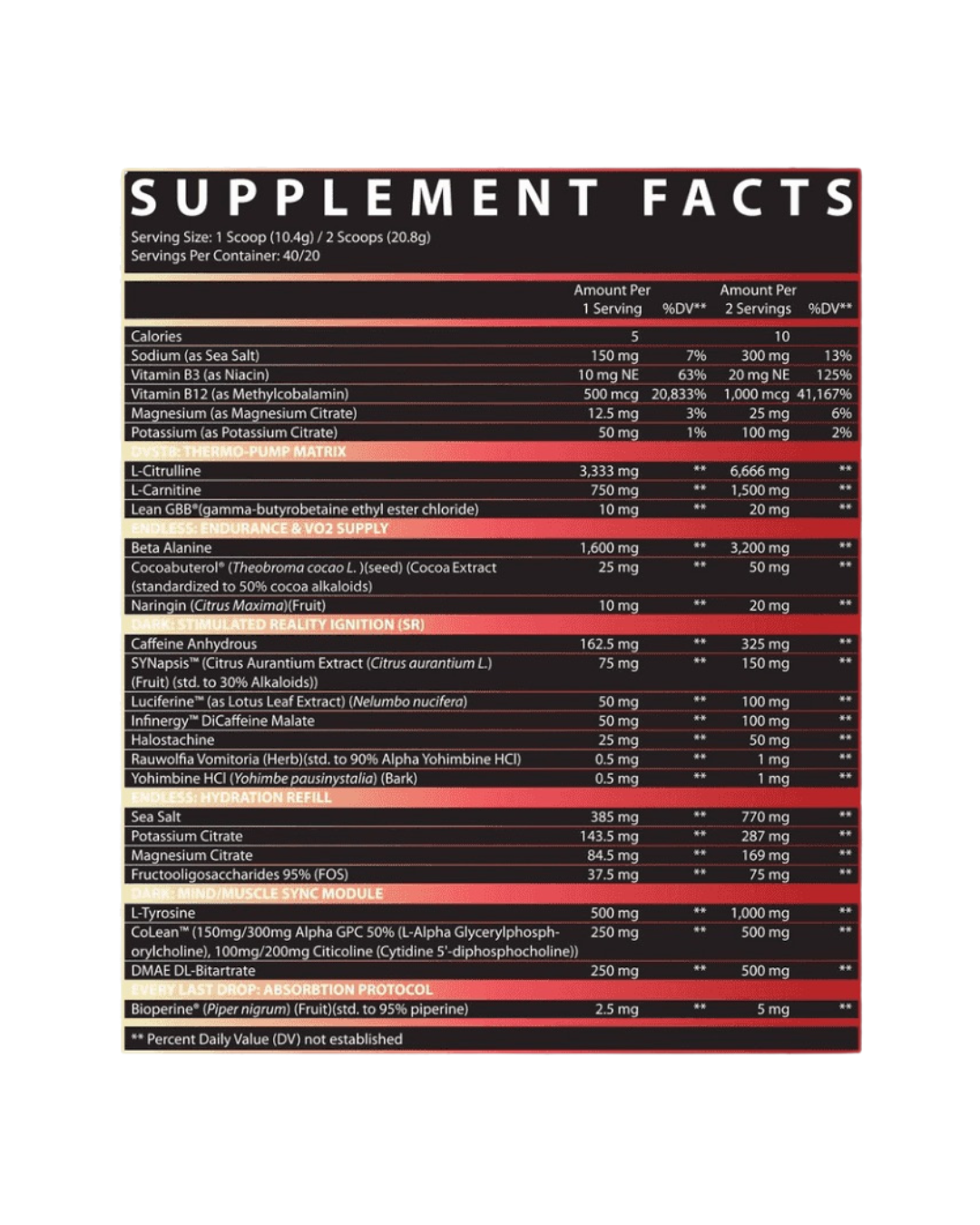 Introducing DVST8 Dark, fresh from the labs at Inspired Nutraceuticals and ready to power your workouts into a new spiritual dimension. Our formulators have strived to distill this high-octane, relentless energy into powder form. By the time your sets are done, the productive devastation on your muscle-tissues will be undeniable.