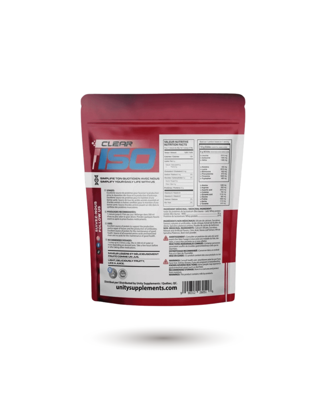 * 27g of pure Protein: Each serving of Unity Supplements CLEAR ISO packs a powerful 27g of pure whey isolate protein, promoting muscle growth, recovery, and overall health. * Experience the clean, pure goodness of our Grass-Fed, Sugar-Free, Ft-Free, Gluten-Free, Lactose-Free, and Keto-Friendly Protein. * Juice-Like Refreshment: Experience a unique and refreshing twist with our clear whey isolate protein, delivering a juice-like texture that stands out from traditional protein shakes. * Easy to mix, add 1 scoop of CLEAR ISO to 500ml of cold water or more according to your taste and ice (optional), shake, and you're ready to go. * Protein is essential for muscle repair, immune system function, and overall well-being, serving as a foundational nutrient that supports numerous physiological processes in the human body.