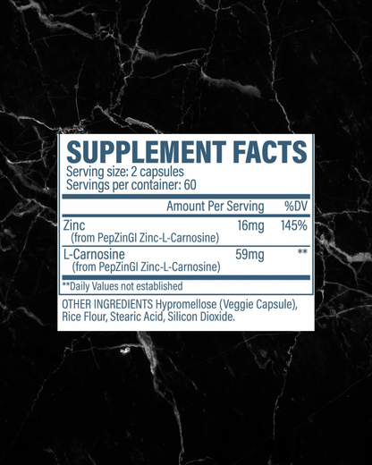 They say the gut is the second brain of the body. A healthy gut can regulate more than just your digestion. The integrity of your gastrointestinal lining is directly connected to the strength of your immune system. The mucosa lining that Zinc Carnosine strengthens is actually one of the first lines of defense of the immune system. Daily supplementation can help reduce irritation of this lining, keeping your immunity strong while supporting gut permeability.